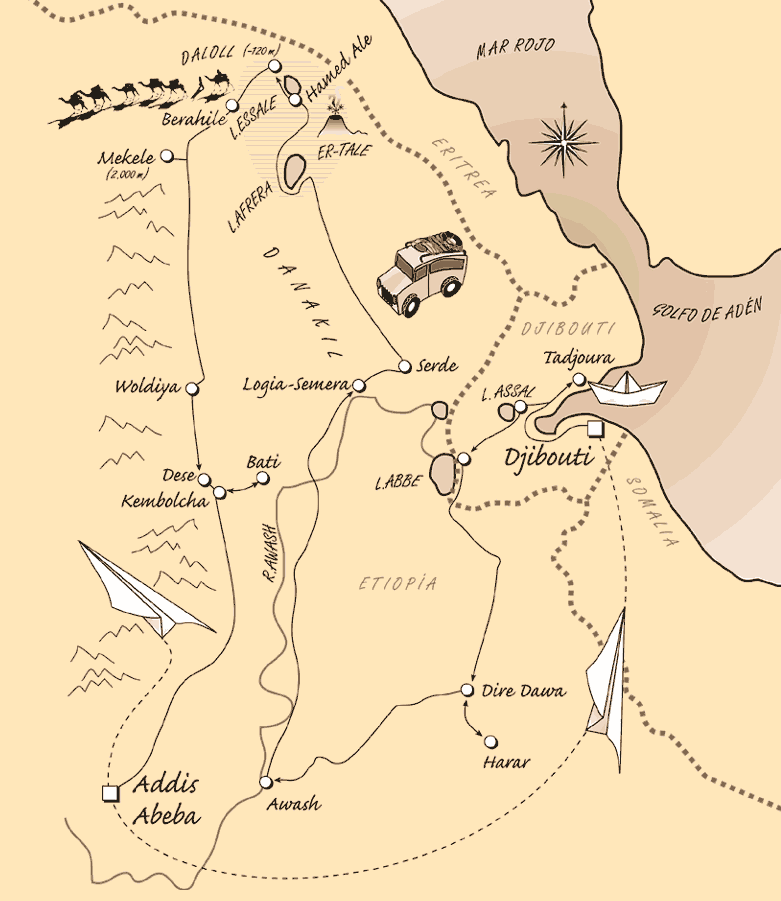 Vuelo a Djibouti–Tadjoiura–Lago Assal–Lago Abbe–Harar–P.N. Awash–Semera–Adfera–Dodom–Volcan Er Tale–Hamed Ale–Mekelle–Woldiya–Bati–Addis Abeba.