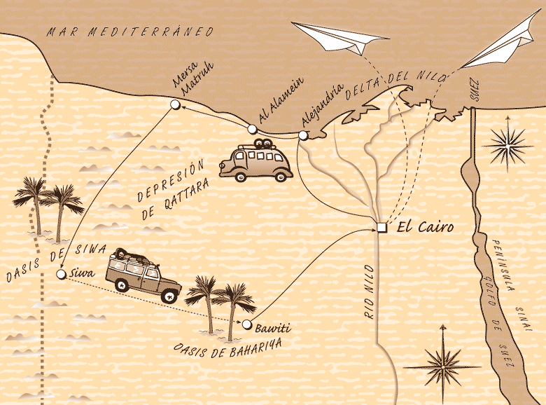 • Alejandría y su nueva biblioteca • Siwa, el oasis olvidado • Aghurmi y el oráculo de Amón • Salhi, restos de la antigua ciudad de Iwa • La colina de los muertos • Oasis de Shyata • Oasis de Bahariya.