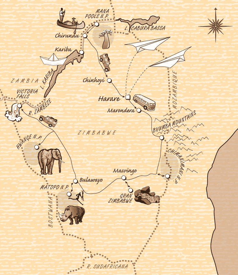 Esta es una ruta en un país abandonado por el turismo. Aunque con infraestructuras, muchas de ellas han caído en desuso precisamente por la propia política del gobierno de Zimbawe, su aislamiento internacional y la ausencia prolongada de visitantes. Combinaremos minibús privado, ferry para atravesar el lago Kariba, canoa durante cuatro días por el Zambeze para ver la vida salvaje del río y sus orillas y vehículos todoterreno para las visitas de los P.N. Matobo, Hwange y Manna Pools. El alojamiento será en hoteles y en acampada. Debido al estado de las infraestructuras y al pésimo funcionamiento del país, el nivel de imprevistos es elevado. Visitamos el país durante el invierno, sin lluvias y con temperaturas agradables. Guía de Banoa.